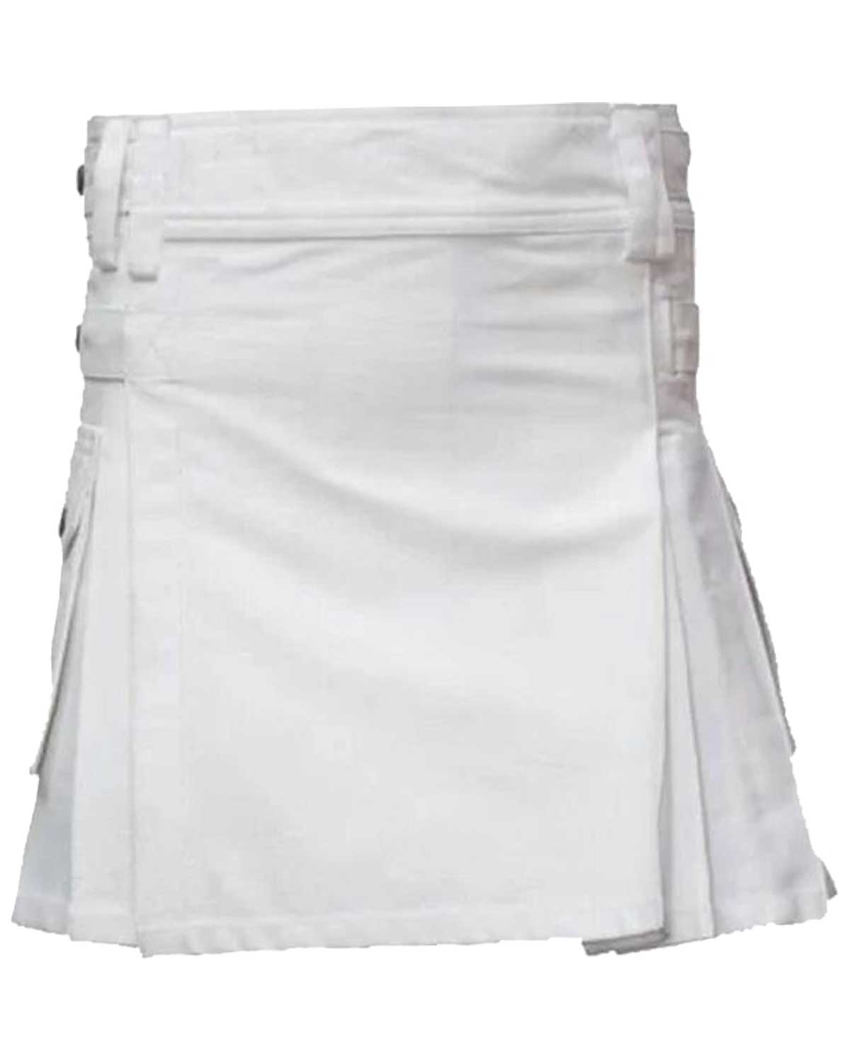 The Ladies White Cotton Utility Kilt isn’t just a garment; it’s an expression of individuality. Whether attending a casual gathering or a formal event. This kilt adapts flawlessly. It reflects the evolving landscape of fashion where women in kilts shine as trailblazers of style.