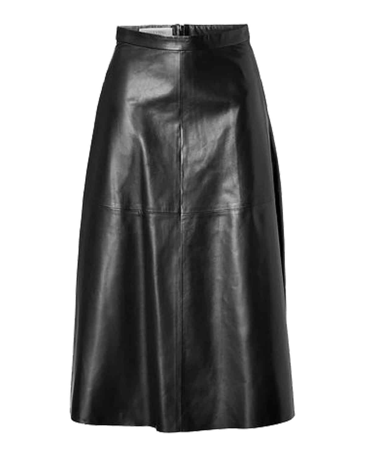 The sleek design of this leather skirt exudes understated elegance with its classic A-line silhouette offering a flattering fit for all body types. The knee-length hemline strikes the perfect balance between sophistication and allure making it suitable for both professional settings and social gatherings. Whether paired with a crisp blouse for a polished office ensemble or styled with a statement top for a night on the town this skirt adds a touch of refinement to any outfit.